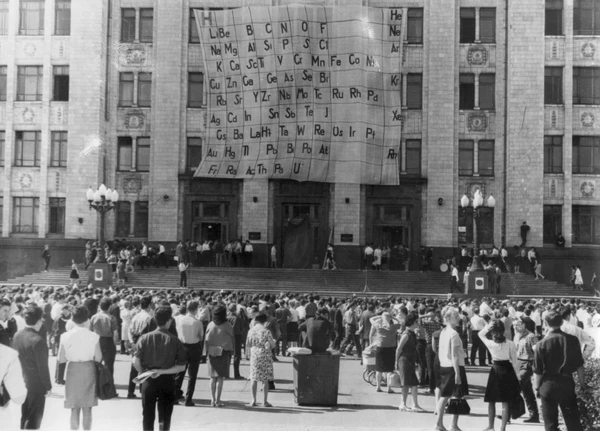 - Парад кафедр химического факультета. Костюмированные группы аспирантов и сотрудников пронесли плакаты, лозунги и схемы, символизирующие разные кафедры факультета.