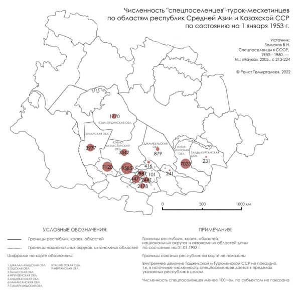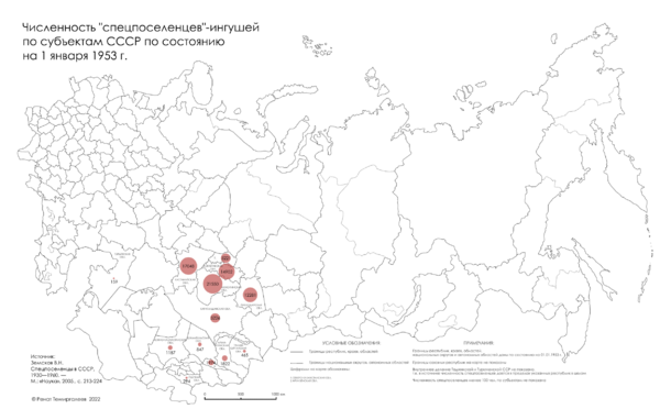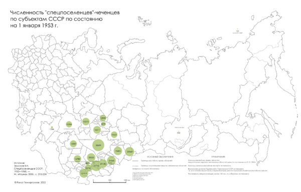 Всего в в СССР в 1944—1945 годах, помимо наказанных народов, подвергшихся тотальной депортации, было принудительно переселено около 260 тысяч человек различных национальностей, в том числе и русских[76]. На конец 1945 года всего на спецпоселении, согласно данным НКВД, находилось 967 085 семей или 2 343 506 человек[77].