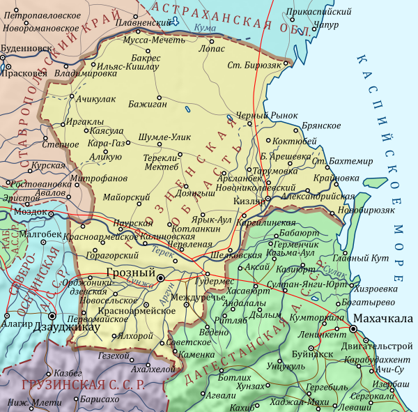 31 января 1944 года принято постановление Государственного комитета обороны СССР № 5073 об упразднении Чечено-Ингушской АССР и депортации её населения в Среднюю Азию и Казахстан «за пособничество фашистским захватчикам». Чечено-Ингушская АССР была упразднена, из её состава в Дагестанскую АССР были переданы 4 района, в Северо-Осетинскую АССР — один район, на остальной территории была образована Грозненская область[69].