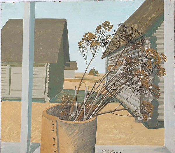 В центре композиции изображён оконный проём с частично открытой левой створкой. На подоконнике размещён жёлтый деревянный сосуд, в котором стоят ветки пижмы и дикого укропа. За окном видны три деревянных дома с высокими двускатными крышами, а на дальнем плане расположены два стога сена. Работа сочетает элементы натюрморта и пейзажа, объединяя вид из окна с изображением сельской местности.