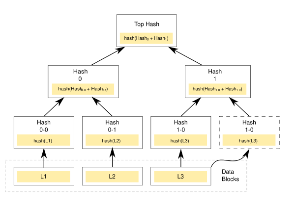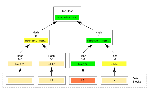 Хеш-деревья имеют преимущество перед хеш-цепочками или хеш-функциями. При использовании хеш-деревьев гораздо менее затратным является доказательство принадлежности определённого блока данных к множеству. Поскольку различными блоками часто являются независимые данные, такие как транзакции или части файлов, то нас интересует возможность проверить только один блок, не пересчитывая хеши для остальных узлов дерева. Пусть интересующий нас блок - это (см. рис.). Тогда доказательством его существования и валидности будут корневой хеш, а также верхние хеши других веток ( и )[1][3]. В данном случае проверка не пройдена, если .