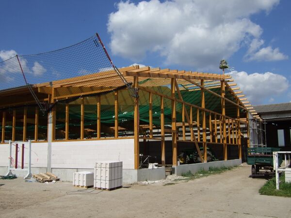 Как правило, в комплект конструкции дома входят все балки и стропила, изготовленные в соответствии с проектом. Стропила из клеёного бруса являются гарантией долговечности как крыши, так и всего здания. Распространённой ошибкой производителей является использование (в целях экономии) сырых досок. В результате конструкцию коробит, нарушается герметичность и геометрия. По установленным стропилам располагается пароизоляция, монтируются рейки обрешётки, затем — кровельный материал, и изнутри — «утепляющий пирог».