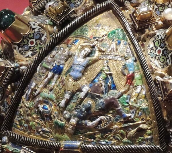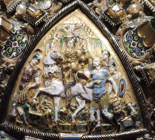 Каталог музея гласит: «Увенчанная высоким крестом держава декорирована большим количеством драгоценных камней в нарядных кастах. Её верхнюю часть украшают высокорельефные, покрытые многоцветной эмалью изображения сцен из жизни библейского царя Давида: „Помазание Давида пророком Самуилом“, „Победа Давида над Голиафом“, „Возвращение с победой“, „Гонение от Саула“. Каждая сцена — это замечательная скульптурная миниатюра, в которой привлекают тщательная проработка черт лиц, деталей костюма, оружия, уверенная передача пейзажа, сложных движений удлиненных фигур с несколько манерными жестами и позами»[3]. Тема помазания Давида на царство имела особое значение для христианских правителей, также помазанников Божьих, именно поэтому она избрана для украшения регалии.