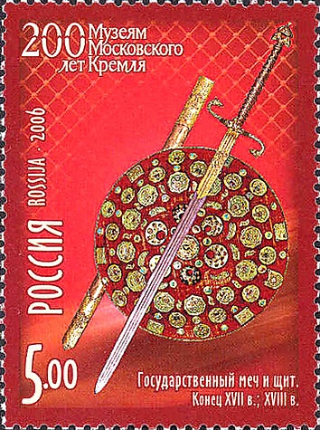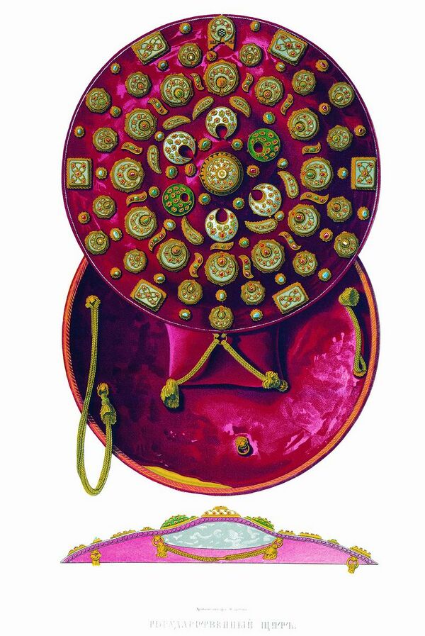 Именно этот щит был выбран среди других подобных экспонатов Оружейной палаты чисто как государственная регалия лишь в XVIII веке, во времена Елизаветы Петровны.[4] Его торжественно выносили при венчании на царство всех последующих монархов в Успенском соборе Кремля. Некоторые авторы указывают, что щит выносился только при погребении[5], однако, согласно описанию коронаций русских царей щит выносили по крайней мере при коронации Александра III.[6]