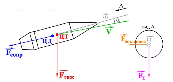 Траектория пули/снаряда — линия не прямая, а приближающаяся к параболе, которая всё более отклоняется вниз от направления оси вращения пули в момент её вылета из ствола. Вследствие одновременного воздействия на пулю вращательного движения и сопротивления воздуха, стремящегося опрокинуть пулю головной частью назад, ось пули отклоняется от направления полёта в сторону вращения. Происходит это потому, что аэродинамический поток постоянно стремится приподнять головную часть пули. Поэтому она начинает занимать всё более выгодное с точки зрения сопротивления положение, так, чтобы ось вращения максимально совпадала с касательной к траектории. Это уводит её по направлению вращения под воздействием Эффекта Магнуса[1].