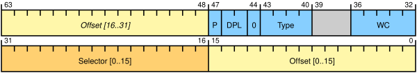 - Тип/права доступа (голубые поля, биты 40-47) — права доступа к шлюзу и его тип (см. Дескриптор сегмента — типы системных сегментов).