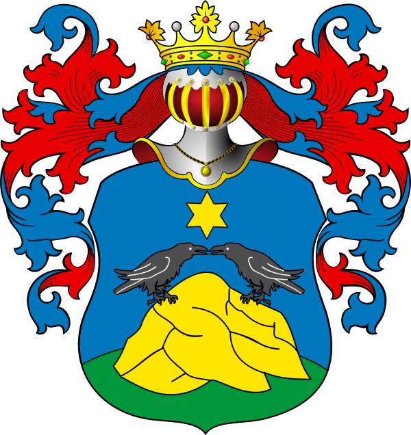 В голубом поле гора золото-скалистая, на мураве; на вершине горы две пёстрые галки, одна к другой обращённые.