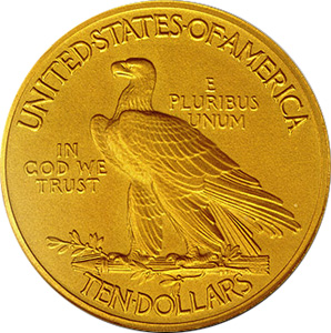На реверсе монеты находится белоголовый орлан с расправленными крыльями — геральдический символ США, держащий в когтях пучок фасций и оливковую ветвь, которые символизируют государственное и национальное единство и желание мира[5]. Сверху расположена полукруговая надпись «UNITED STATES OF AMERRICA», а по бокам девизы «E PLURIBUS UNUM» и «IN GOD WE TRUST». Снизу обозначен номинал монеты «TEN DOLLARS».