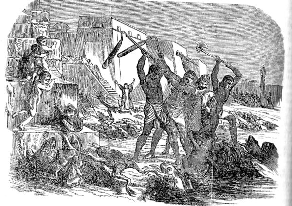 … То же сделали и волхвы [Египетские] чарами своими и вывели жаб на землю Египетскую. И призвал фараон Моисея и Аарона и сказал: помолитесь [обо мне] Господу, чтоб Он удалил жаб от меня и от народа моего, и я отпущу народ Израильский принести жертву Господу. Моисей сказал фараону: назначь мне сам, когда помолиться за тебя, за рабов твоих и за народ твой, чтобы жабы исчезли у тебя, [у народа твоего,] в домах твоих, и остались только в реке.