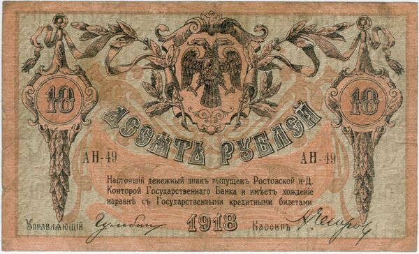 - Билеты 10 рублей выпуска 1910—1914 подписывались управляющим А. В. Коншиным