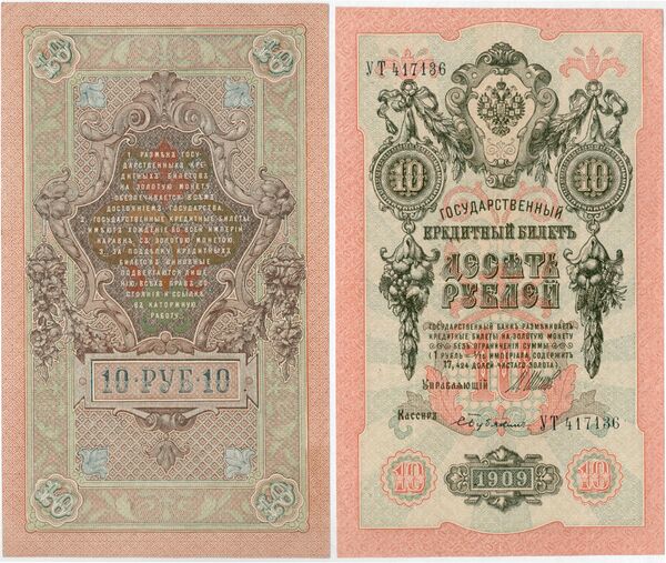 - В 1909 году кредитные билеты 10 рублей подписывались управляющим С. И. Тимашевым