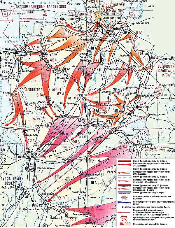По выражению самого Сталина: «Первый удар был нанесён нашими войсками в январе этого года под Ленинградом и Новгородом, когда Красная Армия взломала долговременную оборону немцев и отбросила их в Прибалтику. Результатом этого удара оказалось освобождение Ленинградской области»[2].