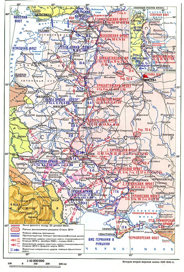Первым ударом в январе 1944 года стала стратегическая наступательная операция войск Ленинградского, Волховского и 2-го Прибалтийского фронтов во взаимодействии с Балтийским флотом с целью разгрома группировки немцев под Ленинградом и Новгородом. Взломав мощную долговременную оборону врага на 300-километровом фронте, советские войска разгромили 18-ю и частично 16-ю немецкие армии группы армий «Север» и к 29 февраля продвинулись на 270 км, полностью ликвидировав блокаду Ленинграда и освободив Ленинградскую область. В результате успешного осуществления первого удара были созданы благоприятные условия для освобождения Прибалтики и разгрома противника в Карелии.