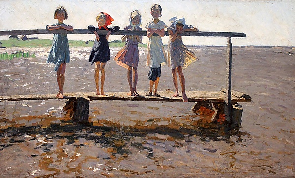Картина изображает на деревянных мостках, возвышающихся над рекой, пять босоногих девочек, облокотившихся на перила и расположившихся вдоль них цепочкой. Их лица скрыты тенью, так как они стоят против солнечного света. Их позы и жесты передают мечтательность, настороженность и раздумье[24]. Игорь Круглый отмечает своеобразие положения рук каждой из них, их причудливые силуэты и «тонкие, как молодые деревца, фигурки». Сами художники отмечали, что не стремились выразить психологию девочек, но она тем не менее раскрывается в индивидуальном характере персонажей, в том, как они восхищаются окружающим их миром, в «мажорном строе живописи». Просветы между фигурами имеют особый ритм. Сцена освещается ярким летним солнцем: «Его лучи, осветив накалённое у горизонта добела небо, скользнули вдали по зелёному бережку озера, яркими против света отблесками легли на цветастые платьица, головки, косынки девочек, мостки, сине-серую с отражениями гладь воды»[5].