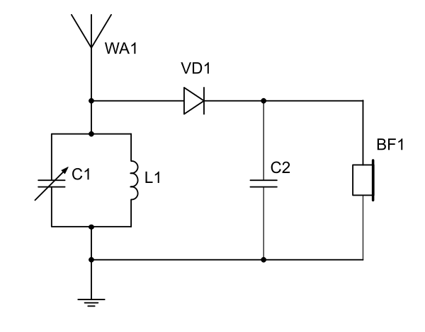 Состоит из колебательного контура, к которому подключены антенна и заземление, и диодного (в ранних вариантах — кристаллического) детектора, выполняющего демодуляцию амплитудно-модулированного сигнала. Сигнал звуковой частоты с выхода детектора воспроизводится высокоомными электромагнитными головными телефонами с сопротивлением не менее 3 кОм, или же пьезоэлектрическими, с очень большим сопротивлением[1][2][3]. Настройка приёмника на частоту радиостанции производится изменением индуктивности контурной катушки или ёмкости конденсатора (последний может отсутствовать, его роль в этом случае выполняет ёмкость антенны и настройка зависит от длины и расположения антенны).