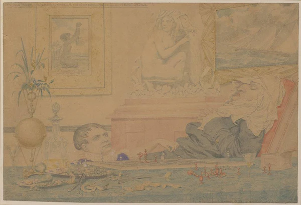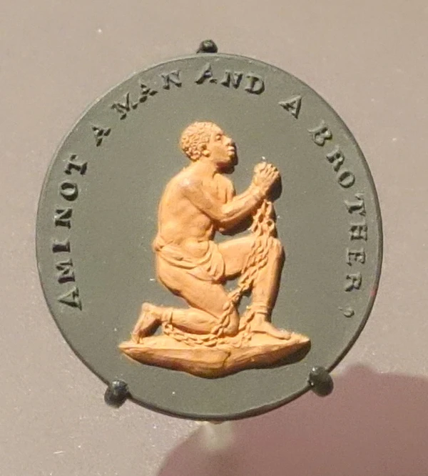 Выше и позади мальчика на стене находится подвергшийся некоторому изменению Даддом знаменитый образ негра-раба, получивший известность благодаря аболиционистскому медальону керамиста Джозайи Уэджвуда (англ. Josiah Wedgwood). 22 мая 1787 года медальон был выполнен в фаянсе, предварительный рисунок для него приписывается художникам Уильяму Хэквуду и Генри Уэбберу (англ. Henry Webber), надпись на нём гласит: «Разве я не муж и брат?» (англ. «Am I not a man and a brother?»). Медальон был использован в качестве логотипа Общества борьбы за отмену рабства в Англии. Ксилография этого логотипа появилась в публикации 1837 года поэтом-квакером и аболиционистом Джоном Гринлифом Уиттьером (англ. John Greenleaf Whittier, 1807—1892) стихотворения «Наши земляки в цепях» (англ. Our Countrymen in Chains). Цена была установлена по два цента за одну ксилографию в розницу, или один доллар за сотню оптом. Ксилография пользовалась широкой популярностью. Но наиболее близка этому изображению на акварели Дадда картина маслом неизвестного художника, выполненная около 1800 года и находящаяся в собрании Wilberforce House Museum[7]. Рядом с этой картиной изображена мраморная статуя вставшей на колено обнажённой женщины, ещё дальше вправо — большая картина в декоративной раме, изображающая плывущий по морю в сильную бурю парусник.