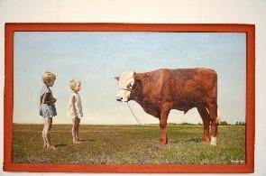 На полотне в жанре бытового жанра изображены две светловолосые девочки с короткими стрижками, стоящие боком на зелёной траве под ясным голубым небом. Девочки одеты в короткие летние платья — слева в голубом, правее в белом — и смотрят на стоящего напротив них коричневого телёнка с белым пятном на голове. На горизонте справа видны зелёные деревья, подчёркивающие простоту и гармонию композиции.