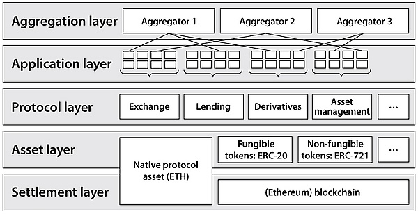 Хотя четыре базовых слоя (уровень расчётов, уровень активов, протокольный слой и уровень приложений) общие, агрегаторы DEX добавляют ещё один — слой агрегации, позволяющий соединять и интегрировать несколько DEX через смарт-контракты.