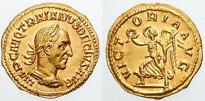 Интересна выпущенная в правление Деция Траяна серия монет с изображениями и именами «divi» (обожествлённых императоров), включающая Октавиана Августа, Веспасиана, Тита, Нерву, Траяна, Адриана, Антонина Пия, Марка Аврелия, Коммода, Септимия Севера и Александра Севера[27]. Тем самым Деций включал себя в общий ряд императоров, представляя своё правление как логичное продолжение римской истории[21]. Этот список практически идентичен с перечнем лучших императоров в биографии Аврелиана в «Истории Августов», в котором отсутствует только Коммод[21]. Однако серия не включает всех обожествлённых императоров. Известно, что обожествлены были Клавдий, Пертинакс, три Гордиана, а также, по сообщению Евтропия[28], и оба Филиппа[21]. Интересно, что все эти монеты были отчеканены не в Риме, а в Медиолане, и предназначались для выплаты жалования солдатам[25]. Из этого следует, что пропаганда Децием своих знаменитых предшественников была направлена не столько на граждан, сколько на армию[25]. По всей видимости, император хотел напомнить легионерам о великих деяниях прежних императоров и повысить их боевой дух[25].