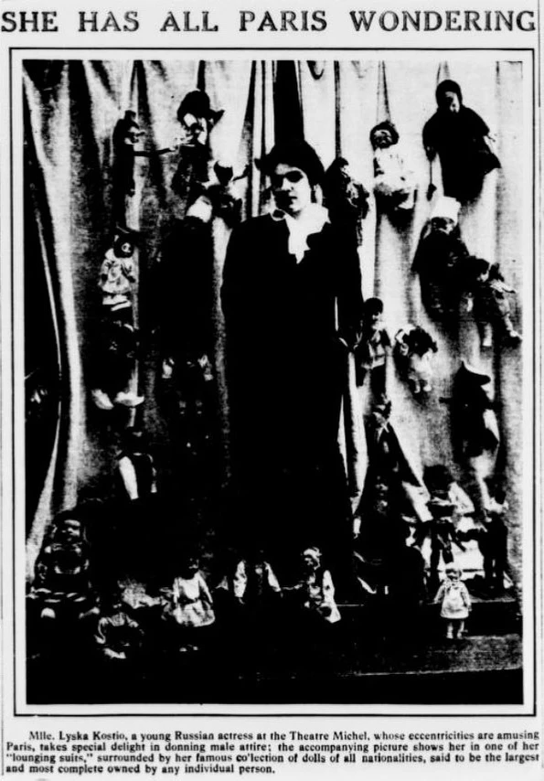 Годом ранее она уже привлекла к себе внимание, прогуливаясь по эспланаде в Довиле с будущей киноактрисой Жаклин Форзан в манере «животом вперёд и зонтиком под мышкой»[7]. Другое эксцентричное появление задокументировано в выпуске нью-йоркской ежедневной газеты The Sun: на фотографии она изображена со своей коллекцией кукол[8], с которыми регулярно появлялась на публике. Она также была известна как «Королева танго»[9]. Костио снесла стены своей квартиры на авеню дю Буа (ныне Авеню Фош), чтобы создать большой танцевальный зал, украшенный расписными панно работы Леона Бакста[9]. В начале августа 1914 года, когда была объявлена всеобщая мобилизация, её танцевальный зал был превращён в госпиталь, где она вместе со своей горничной ухаживала за ранеными на войне[9].