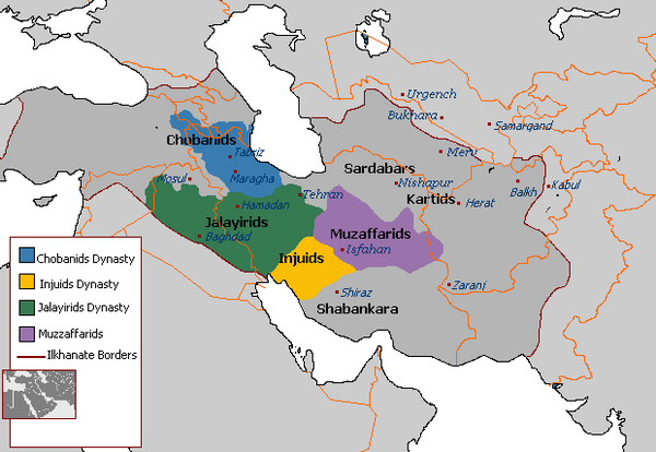 Сыном Хусейна был Хасан Бузург (Хасан Большой), правивший от имени подставных ханов-Хулагуидов, а затем провозгласивший себя султаном, утвердившись в Ираке Арабском (1340). Его преемник Шейх Увейс I в 1357 году одержал победу над чобанидом Ахичуком, после чего весь Азербайджан перешёл под власть Джалаиридов. В 1364 году Увайс покорил также Мосул, а в 1368 году совершил завоевание Ширвана[23].
