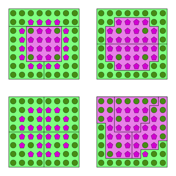 Справа изображён квадратный «штат», от которого в парламент избираются четверо депутатов-мажоритарщиков. Жители центра голосуют за «фиолетовых», а жители окраины — за «зелёных», при этом зелёные побеждают с незначительным перевесом. «Честное» деление на округа, учитывающее неоднородность населения, приводит или к победе зелёных 3:1 (рис. 1), или к ничьей 2:2 (рис. 2). Если зелёные разделят штат так, чтобы в каждый округ попала и часть центра, и часть периферии, фиолетовые вообще не попадут в парламент (рис. 3). Если же разделить центр на три округа, а периферию частично сконцентрировать в четвёртом, частично «размазать» по первым трём, как на рис. 4, победят уже фиолетовые.