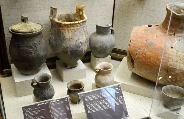 Городища были окружены могильниками, в которых совершались захоронения в кирпичных склепах, ямах, ямах с нишами, ямах с подбоями.[8] Также встречаются катакомбы. Среди находок – фибулы, ременная гарнитура, зеркала, янтарные и стеклянные бусы, антропо- и зооморфные фигурки и налепы на керамике, золотые украшения, резные иранские геммы (камни-печати), китайский, индийский и другой импорт[9].