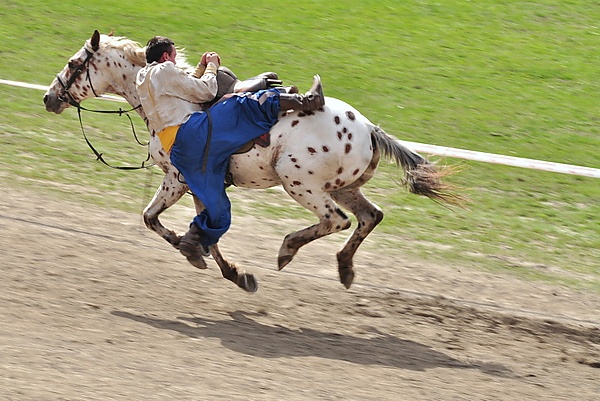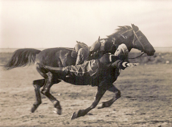- На полном ходу соскакивание с лошади назад и в тот же момент вскакивание опять на лошадь сзади же, притянувшись за хвост