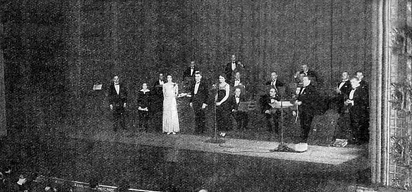 - 20 октября 1930 года Джиллетт исполнил первую серийную радиоверсию Шерлока Холмса в премьерном эпизоде The Adventures of Sherlock Holmes («Приключения Шерлока Холмса»), адаптации рассказа «Пёстрая лента»[58]. Она была основана на оригинальной театральной версии Конан Дойла, переработанной Эдит Мейзер, и это был первый раз, когда Холмс был изображён на радио как часть продолжающегося сериала. Он транслировался WEAF-NBC (Нью-Йорк) и спонсировался компанией G. Washington Coffee Co.. Это шоу стало пилотом сериала, и после Джиллетта роль в остальных 34 программах сериала взял на себя Ричард Гордон[59].