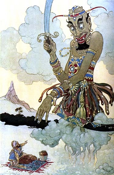 В западной культуре джинн прежде всего известен из сказки «Тысяча и одна ночь» как «волшебный дух со скрещёнными руками, внешне похожий на человека, но заточённый в лампе и исполняющий три любых желания тому, кто потёр лампу и пробудил джинна».