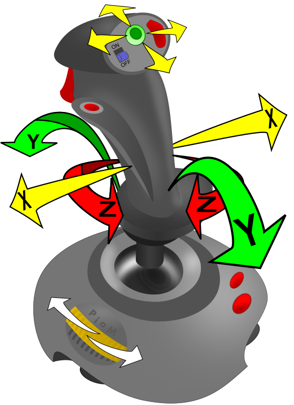 Джойстик позволяет управлять виртуальным объектом в двух- или трёхмерном пространстве. Помимо координатных осей «X» и «Y», некоторые джойстики способны предоставлять координаты оси «Z», посредством вращения ручки джойстика вокруг её оси, либо с помощью дополнительного управляющего элемента на основании джойстика. Программное обеспечение, получив информацию о координатах «X-Y-Z», позволяет пользователю управлять неким виртуальным объектом, отображаемым на мониторе. На ручке джойстика и на его основании обычно располагаются кнопки, переключатели, слайдеры, крестовина и другие управляющие элементы различного назначения.