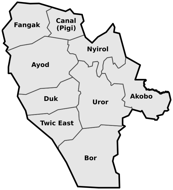 Административный центр — город Бор. На западе штата, где находится географический центр страны, планируется строительство новой столицы Южного Судана города Рамсель.