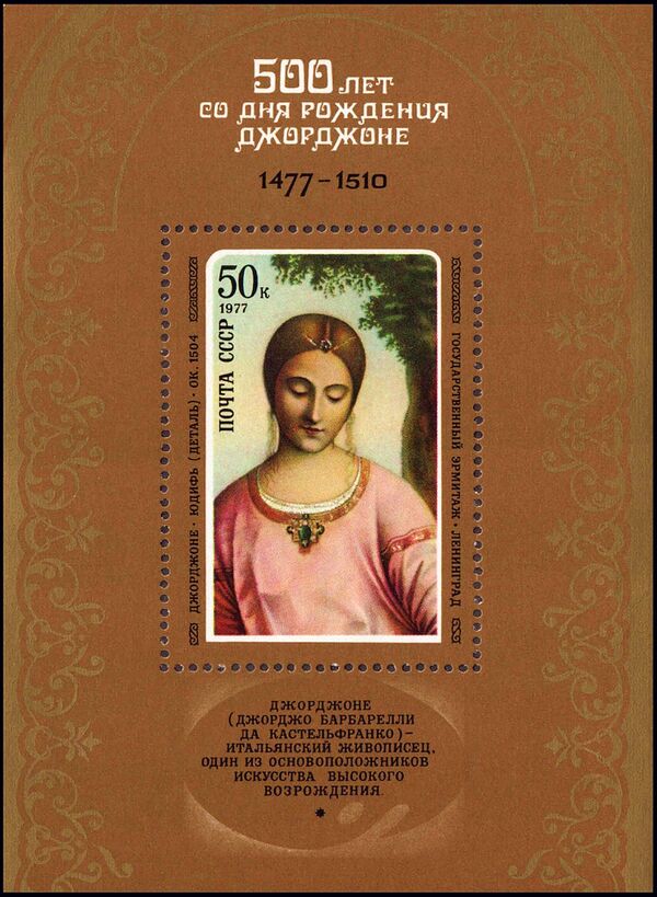 - К 500-летию со дня рождения Джорджоне, итальянского художника, представителя Венецианской школы живописи, Почта СССР в 1977 году выпустила почтовый блок СССР, 50 коп. (Каталог ЦФА № 4717, Michel № 4613, Scott № 4578).