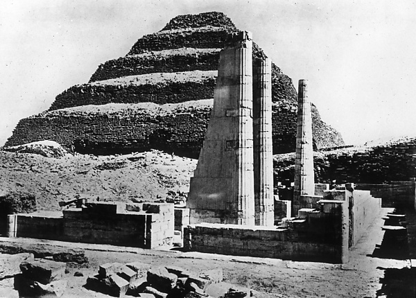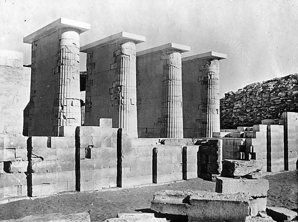 Качественная имитация в каменном сооружении построек, сделанных из кирпича-сырца и дерева, является одной из наиболее характерных черт пирамидного комплекса. К примеру, ворота святилищ тщательнейшим образом вырезаны из первосортного известняка так, чтобы они напоминали деревянные, установленные в полуоткрытом положении. На них изображены задвижки, дверные петли, панели, перекладины, бруски. Имхотеп, впервые использовавший колонны, не рискнул оставлять их без опоры — они выступают из стен. Впервые здесь были сооружены каменные колонны в виде гигантских связок стеблей папируса, а также колонны с каннелюрами.