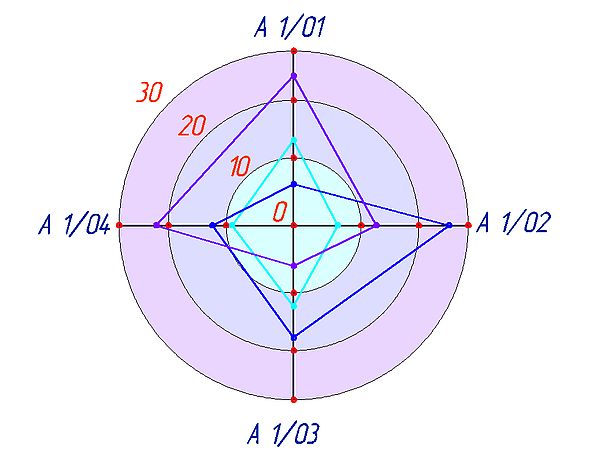 В отличие от линейных диаграмм, в радиальных или сетчатых диаграммах более двух осей. По каждой из них производится отсчёт от начала координат, находящегося в центре. Для каждого типа полученных значений создаётся своя собственная ось, которая исходит из центра диаграммы. Радиальные диаграммы напоминают сетку или паутину, поэтому иногда их называют сетчатыми. Преимущество радиальных диаграмм в том, что они позволяют отображать одновременно несколько независимых величин, которые характеризуют общее состояние структуры статистических совокупностей. Если отсчёт производить не с центра круга, а с окружности, то такая диаграмма будет называться спиральной диаграммой[5][8].