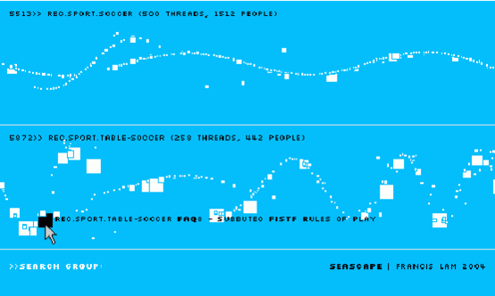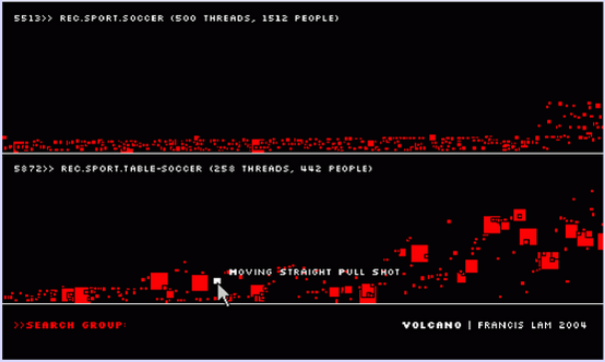 Под руководством Френсиса Лама (Francis Lam) исследователи создали два интерфейса анимированных диаграмм Seascape и Volcano. Характер изменений изображения на диаграммах свидетельствует о социальной активности пользователей ресурса. Например, размер квадратиков указывает на объём темы — чем больше площадь квадратика, тем больше объём обсуждаемой темы. Эти квадратики находятся в постоянном движении, представляющем собой, похожие на гармонические, колебания в плоскости диаграммы, смещающиеся линейно в какую-либо из сторон. По скорости движения можно судить об активности темы, а амплитуда колебаний показывает разницу во времени появления новых сообщений. В любой момент, наведя курсор в плоскость диаграммы, её можно остановить, выбрать интересующий квадратик и открыть тему, которой он соответствует. Открывающаяся в этом же окне тема, также представляет собой анимацию из кружочков, движущихся в разные стороны в пределах окна по типу Броуновского движения. Кружочки символизируют действия отдельных пользователей, и скорость их движения напрямую зависит от активности этих пользователей.