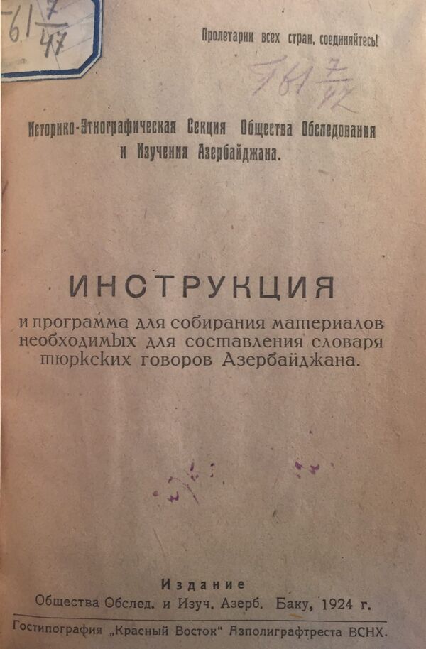 С начала XX века азербайджанские и зарубежные авторы занимались изучением диалектов и говоров азербайджанского языка. В 1903-1904 годах основатель иранской тюркологии Карл Фой провёл исследование диалектов Иранского Азербайджана и выпустил статью «Azerbajganische Studien mit einer Charakteristik des Südtürkischen» в двух частях. Он писал о распространении азербайджанского языка вплоть до Эрзерума. В 1921 году французский востоковед Хельмут Риттер написал статью «Azerbeidschanische Texte zur nordpersischen Volkskunde» о диалектах Иранского Азербайджана[13]. В середине 1920-х годов член-корреспондент Академии наук СССР Н. И. Ашмарин, приглашенный в Азербайджанский государственный университет, а также в «Общество изучения Азербайджана», составил программу и инструкцию по сбору материалов для словаря диалектов и говоров азербайджанского языка. По этой программе и инструкции до 1930 года было собрано около 60 000 слов. На основе этих материалов были изданы две части «Словаря азербайджанско-тюркских народных говоров», в 1930 году (буква «А») и в 1931 году (буква «Б»)[14]. После нескольких поездок в Шекинский район для сбора сведений по шекинскому диалекту, в 1926 году Ашмарин выпустил труд «Общий обзор народных тюркских говоров гор. Нухи». Она стала образцом для всех последующих монографических исследований азербайджанских диалектов. В том же году обществом обследования и изучения Азербайджана была издана работа И. Гасанова «Склонение имён существительных (без притяжательных аффиксов в говоре, употребляемом коренным населением Гянджи)»[15].