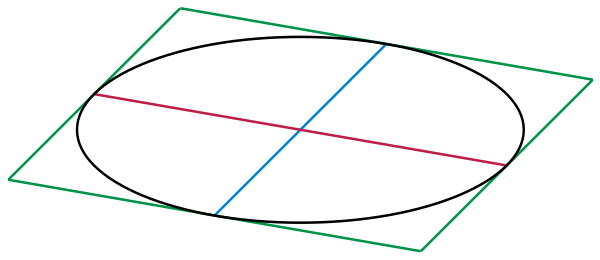 На рисунке представлена пара сопряжённых диаметров (красный и синий). Если в точках пересечения диаметра с эллипсом провести прямую, параллельную сопряжённому диаметру, то прямая будет касательной к эллипсу, и четыре таких касательных ко всем четырём концам пары сопряжённых диаметров эллипса образуют описанный около эллипса параллелограмм (зелёные линии на рисунке).