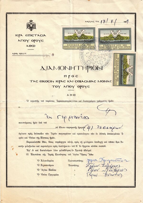 - общее разрешение (геникон диамонитирион) — выдается Бюро паломников министерства Македонии и Фракии в Салониках и даёт право пребывания на Афоне в течение 4-х дней и ночевки в любом монастыре; при необходимости его можно продлить на самом полуострове, в Карее