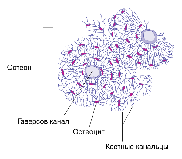 Остеоны (структурные единицы кости, «гаверсовы системы»), формирующие средний слой диафиза, представляют собой цилиндрические структуры, состоящие из «вставленных» друг в друга костных пластинок (обычно 5—20), окруженных межклеточным веществом с замурованными в него костными клетками. Располагаются остеоны преимущественно вдоль длинной оси кости. Остеоны ограничиваются друг от друга цементирующим матриксом (основным веществом). В центральном канале остеона расположены кровеносные сосуды, соединительная ткань и остеогенные клетки; каналы остеонов сообщаются друг с другом посредством анастомозов.