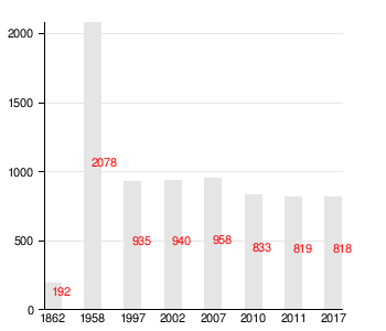 Станция железной дороги. На этом протяжении дороги находится 49 сторожевых будок и 7 казарм для рабочих. (1862 год)[4]