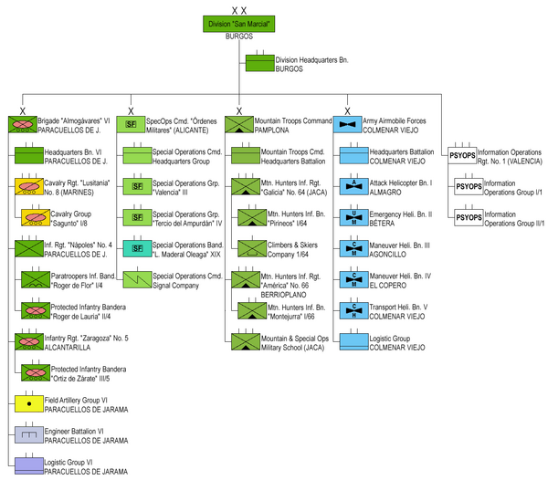 Дивизия «Сан-Марсиаль» была создана в ходе реорганизации вооружённых сил Испании с целью оптимизации их структуры для модернизации с учётом появления новых и перспективных глобальных вызовов, а также технических требований, предъявляемых современным войскам.[3] Дивизия включала ранее в себя на 2016 год «тяжёлые» (механизированные) бригады и горные войска.[4] Дивизия унаследовала имя 5-й лёгкой пехотной бригады «Сан-Марсиаль» (Brigada de Infantería Ligera «San Marcial» V). Кроме непосредственной подготовки подразделений,[5] дивизия адаптирована для выполнения задач гражданских операций, вроде гуманитарной помощи в зоне конфликтов, эвакуации гражданских и пр.[6] Подразделения дивизии позволяют решать широкий круг задач, от непосредственной обороны страны до участия в международных операциях и помощи союзникам.[7]
