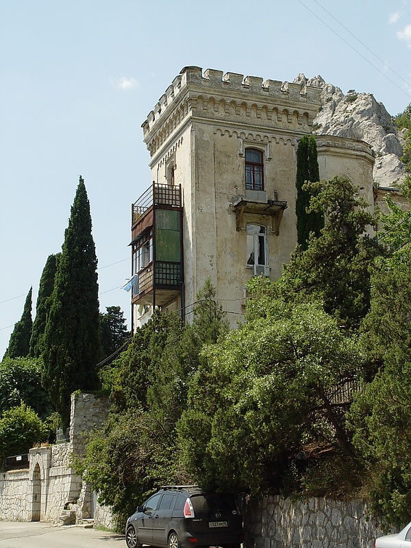 Здание, стоящее на взгорке, на площадке, укреплённой высокой подпорной стеной с ажурной решёткой, в соответствии модному тогда стилю модерн, построена в духе средневекового европейского замка. В архитектуре его прослеживаются элементы неоготики: прямоугольная основная часть здания, состоящая из двух объёмов: четырёхэтажной башни с зубцами по верху и с парапетом и правого двухэтажного крыла, с декоративными башенками-дымоходами, уравновешивается композицией фасада, обращенного к улице и представляющего собой здание, украшенное деревянными решётками балконов с изображением мальтийских крестов, при этом правое крыло образует небольшой внутренний двор. Горизонтально здание расчленено линиями открытых балконов[3][4], окона виллы разной формы: прямоугольные, круглые, стрельчатые[5]. В здании было 19 комнат, предназначавшихся как для личного пользования хозяев, но и для организации пансиона. Со временем владелец начал сдавать всю виллу отдыхающим, а для своей семьи возвел в 1916 году небольшой домик на другом участке[6].