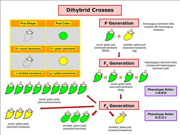 Дигибридное скрещивание — скрещивание организмов, отличающихся по двум парам альтернативных признаков, например, окраске цветков (белая, смешанная или окрашенная) и форме семян (гладкая или морщинистая).