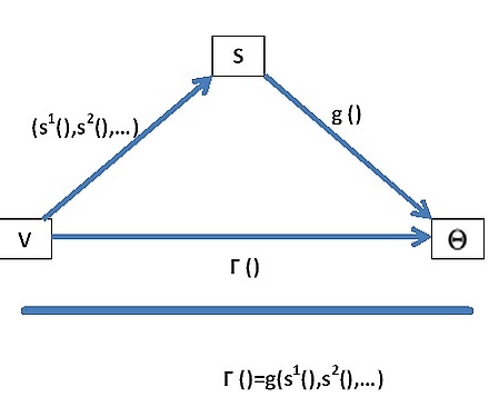- механизма . Исходя профиля предпочтения из множества агент выбирает стратегии , которые имеют равновесие, подмножество . Функция исходов имеет равновесные стратегии на множество социальных состояний . Часть равновесий (все — при полной реализации) приводит к социальному состоянию .