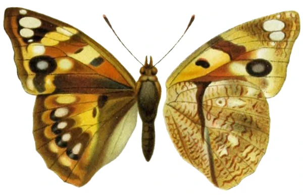 Задние крылья у обоих полов на нижней стороне оранжевые в коричневых пестринках с коричневой срединной перевязью, которая идет от середины переднего крыла края и прерывается вблизи анальной жилки. В своей задней части перевязь осветлена с внутренней стороны[1].