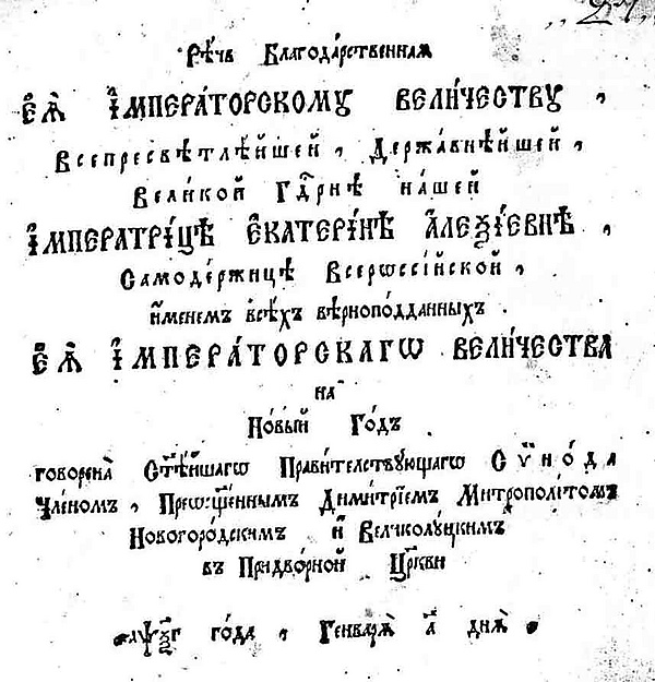 Что речемъ, сынове россійстіи? Благодаряще благодаримъ Вышняго, владѣющаго царствомъ о благополучіи нашего; ему же восхоте дарова, вознесе избраннаго отъ людей своихъ. Но что тебе, дражайшій государь, въ сій день благополучія и прославленія Божескія принесемъ? Отроковица иногда, услышавши гласъ тезоименитаго твоего Петра, не отверзетъ отъ радости дверей. Мы, видѣвше и свѣтлое лицо твое и слышавши твой гласъ, не можемъ от радости отверсти устенъ, но отверзаемъ пламенемъ любве и въ вѣрности горящая сердца; твоя отъ твоихъ приносимъ; воспріими прародительскій престолъ твой, ещё въ 1742 году тебѣ въ наслѣдіе врученный и присягою утверждённый, во странахъ Европы и Азіи проповѣданный. Успѣвай и царствуй, пріими государство твое въ крѣпкое защищеніе. Защити матерь свою христову церковь, въ ней же духомъ святымъ рожденъ еси; заступи обидимыя, устраши злыхъ, возлюби добрыхъ, управляй своима очима и рукама великое сіе служеніе.