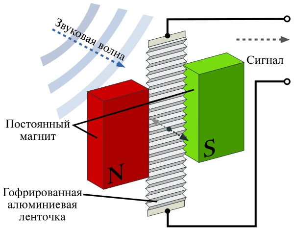 В электродинамическом микрофоне ленточного типа вместо катушки в магнитном поле располагается гофрированная ленточка из алюминиевой фольги. Под действием звука ленточка колеблется, при этом на концах ленточки наводится ЭДС звукового сигнала. Такой микрофон имеет высокое качество и применяется, главным образом, в студиях звукозаписи.
