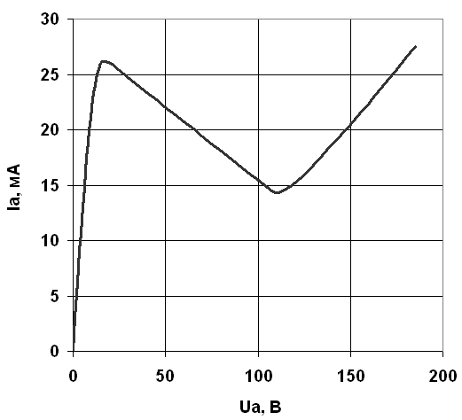 | Нелинейность (изломы) монотонно-возрастающей зависимости тока анода от напряжения на аноде. При малых анодных напряжениях рост анодного тока может отставать от расчётного «триодного» характера зависимости (закон Чайлда-Ленгмюра), однако при всех режимах внутреннее сопротивление остаётся положительным. Такое поведение свойственно мощным низкочастотным пентодам и лучевым тетродам. Нормальные рабочие режимы этих ламп, как правило, лежат далеко за пределами «динатронных» участков их ВАХ. | |