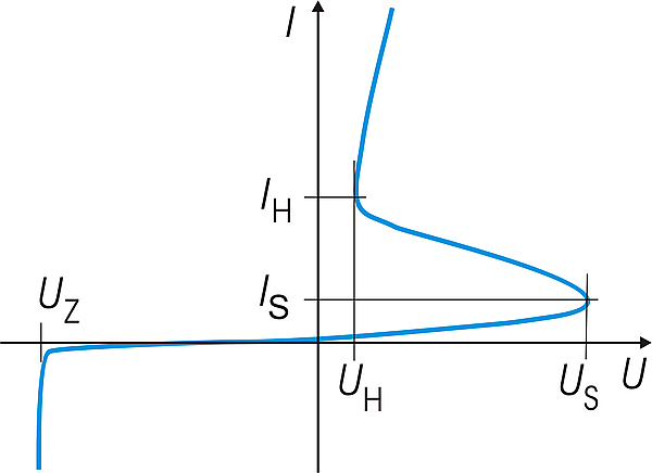 С S-образной ВАХ связано явление гистерезиса: при увеличении напряжения прибор находится в запертом состоянии до достижения напряжения включения при уменьшении тока через прибор остаётся в открытом состоянии до достижения напряжения удержания причём